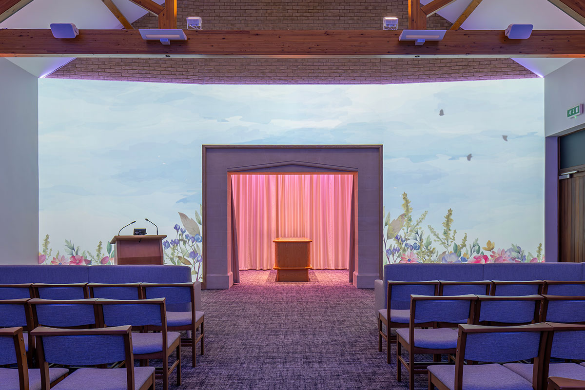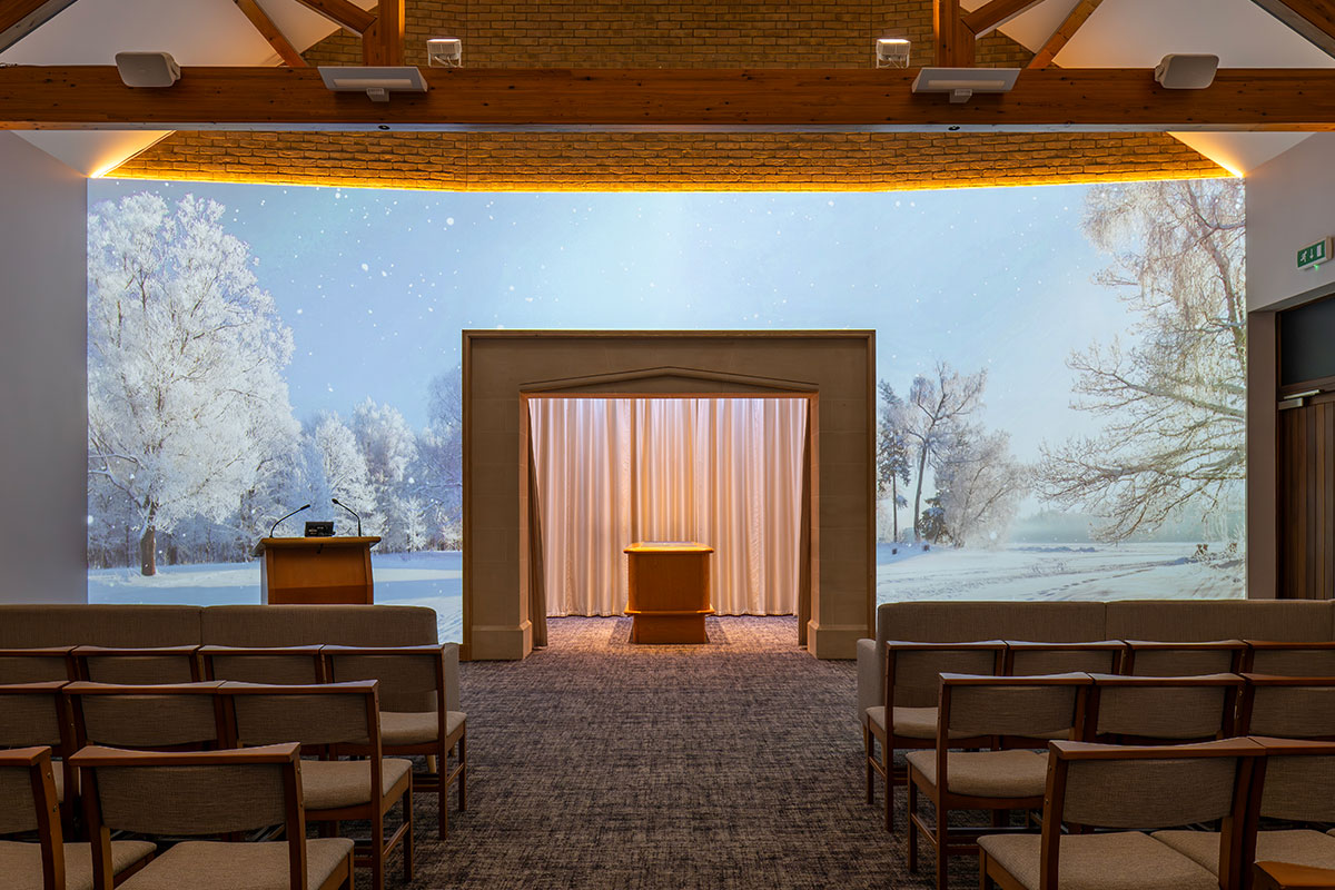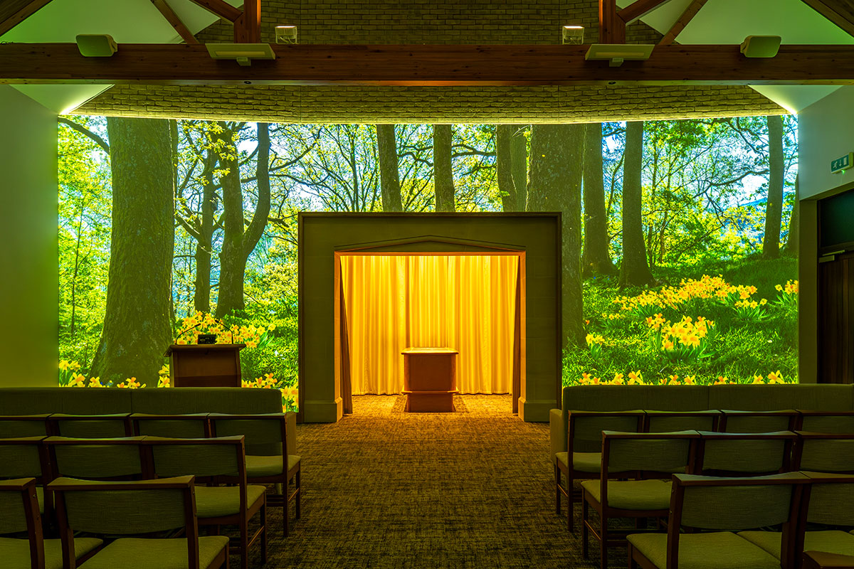 Our chapel can host religious and non-religious traditional services and all above mentioned features can be switched off to facilitate a simpler, traditional service.